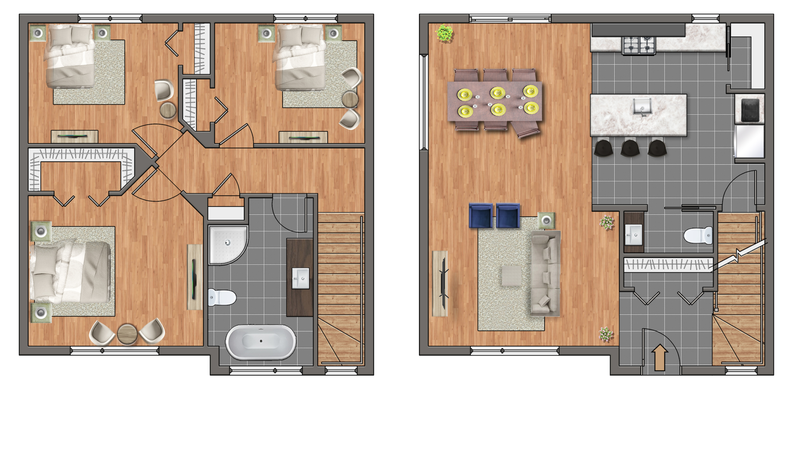 Avec ou sans garage, le modèle VITA séduit par son design intelligent et son aménagement chaleureux. Son aire ouverte baignée de lumière naturelle favorise une ambiance conviviale, idéale pour profiter pleinement des moments en famille ou entre amis. La cuisine, la salle à manger et le salon s’y enchaînent harmonieusement, tandis qu’une petite salle d’eau pratique complète le rez-de-chaussée.